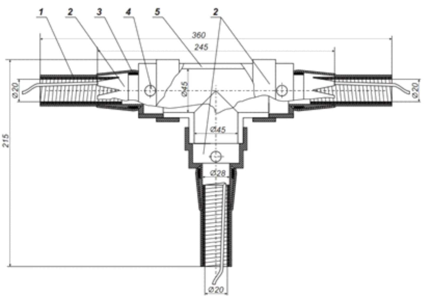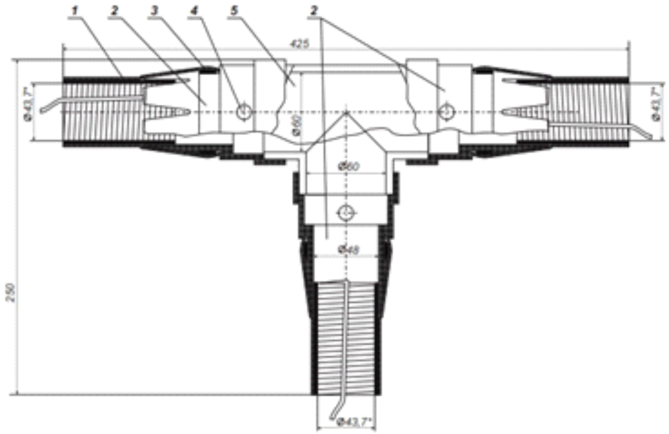 Муфта состоит из Т-образного полиэтиленового корпуса, холодноусаживаемых полумуфт и набора дополнительных материалов.
